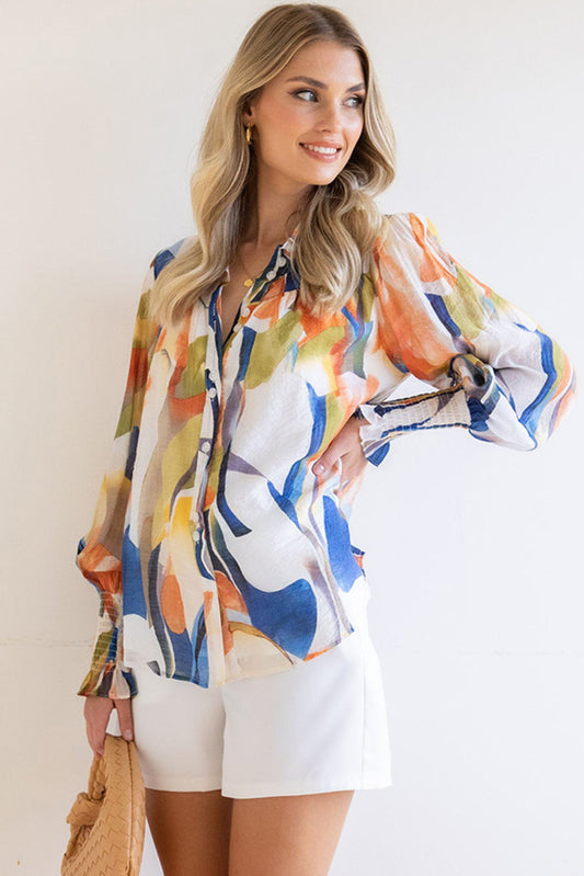 Abstract Print Buttoned V Neck Long Sleeve Blouse