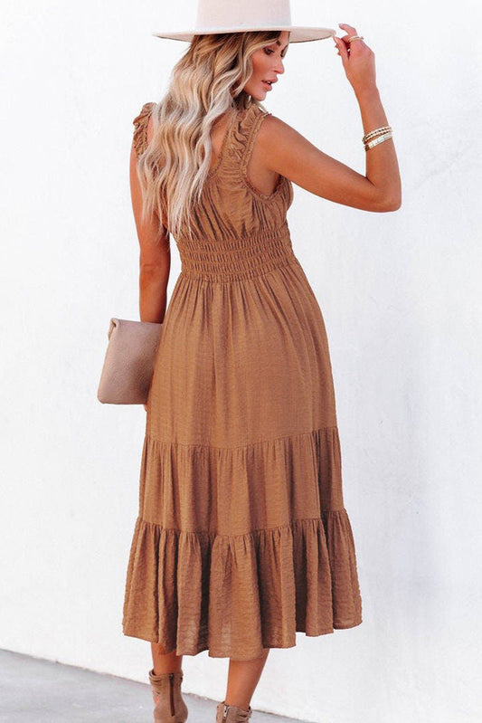 Smocked Ruched Sleeveless High Waist Midi Dress