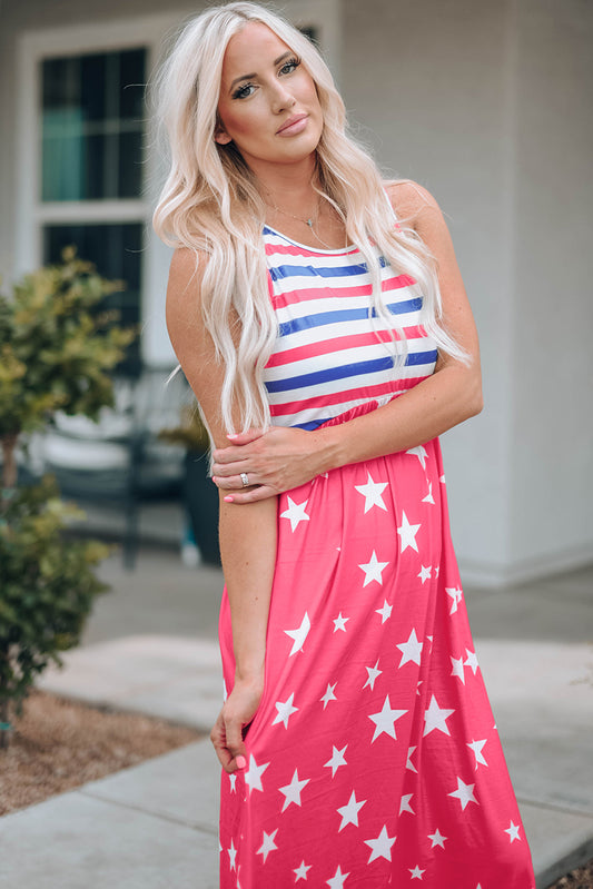 Red Stars and Stripes Print Sleeveless Maxi Dress