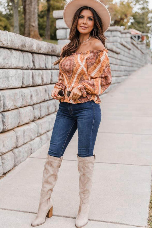 Boho Print Smocked Puff Sleeve Peplum Blouse