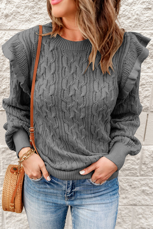 Gray Ruffled Trim Ribbed Knit Long Sleeve Sweater