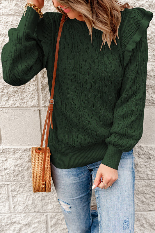 Green Ruffled Trim Ribbed Knit Long Sleeve Sweater