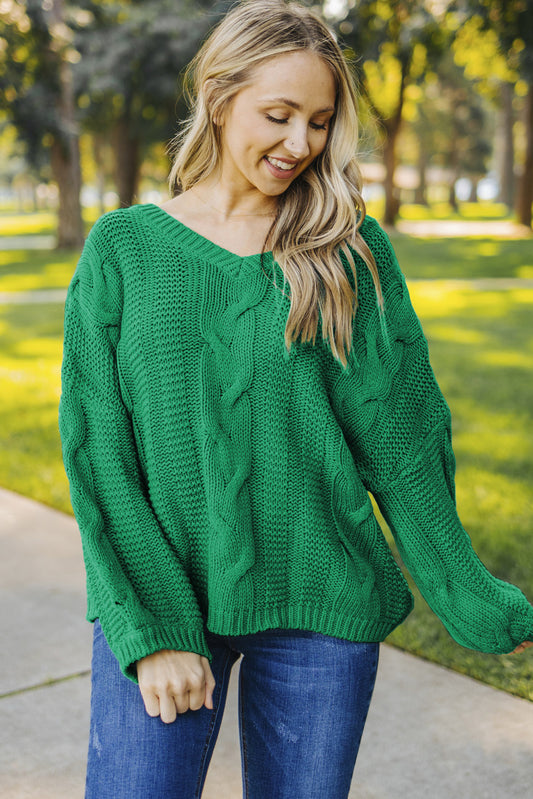Green Bubblegum V-Neck Braided Knit Sweater