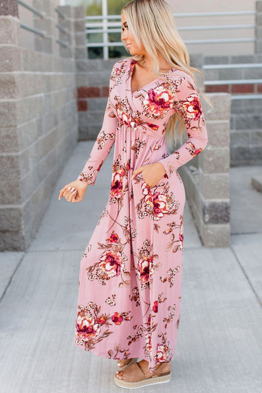 Pink Floral Long Sleeve V-Neck Maxi Dress