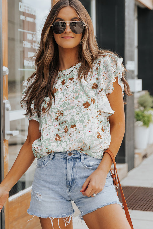 Green Floral Ruffle Short Sleeve Top