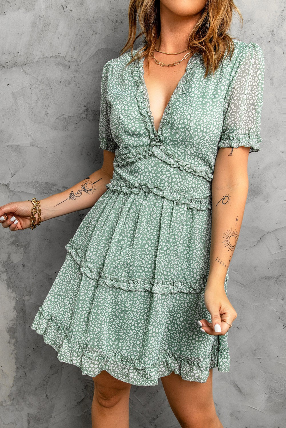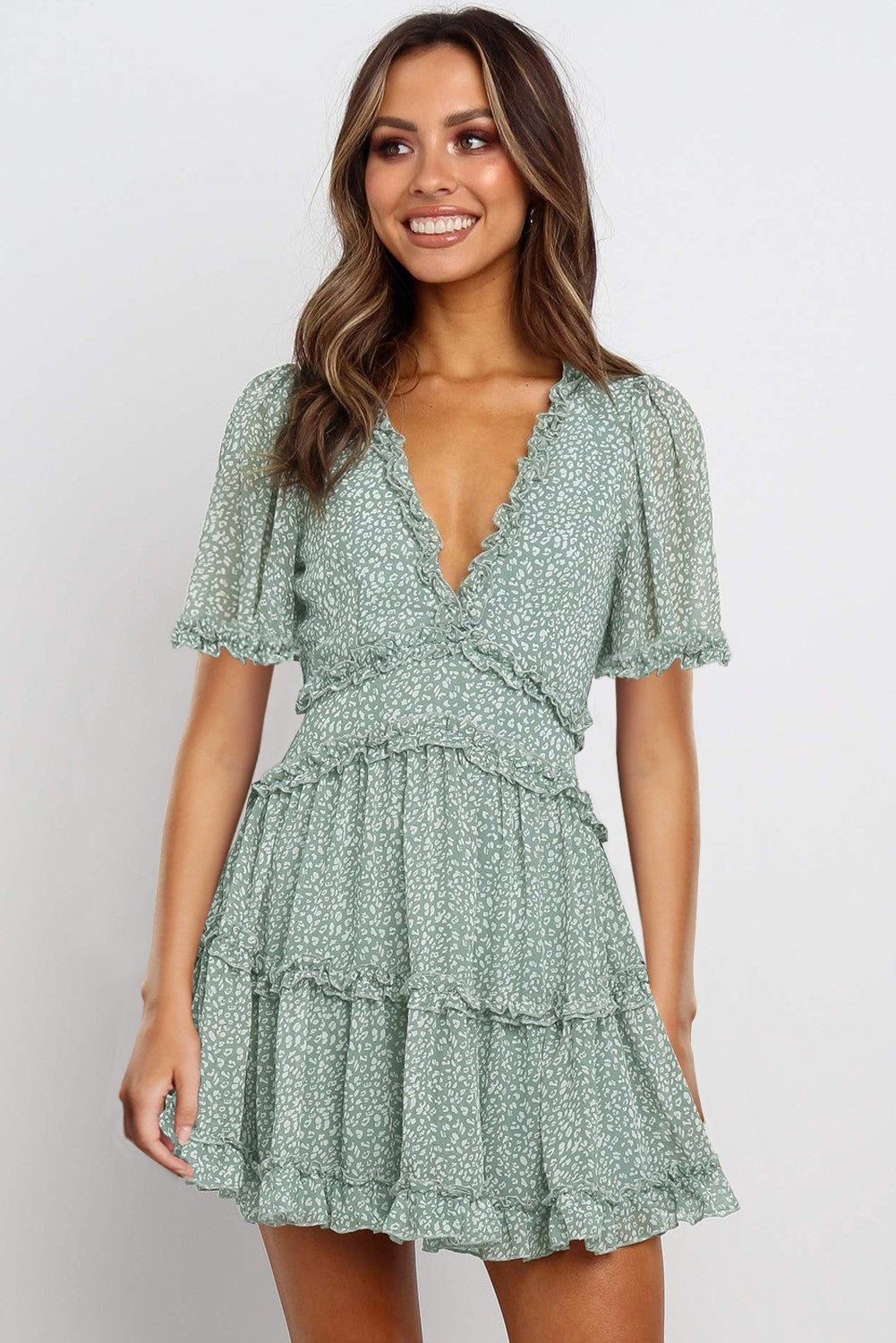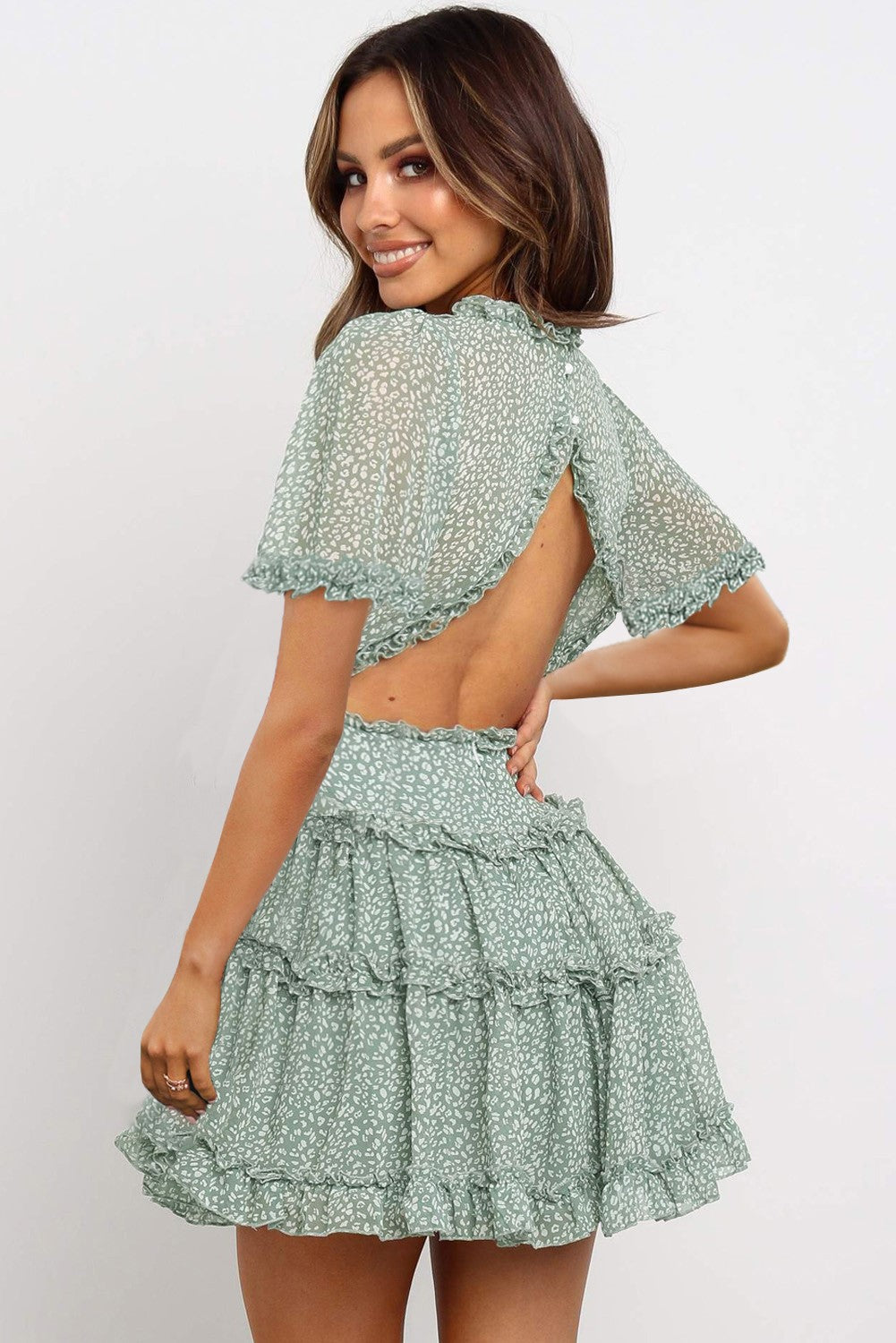 - Ruffles adorn the mini dress, creating a romantic silhouette.